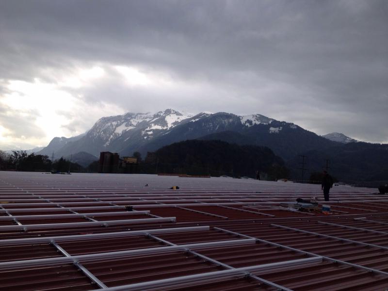 Auf der Lager- und Kühlhalle eines großen Gemüsebauers im Schweizer Rheintal realisiert die Schmidt Consulting & Vertrieb Schweiz GmbH (SCuV) das derzeit größe Photovoltaikprojekt. "Auf einer Dachfläche von fast 6.000 qm entsteht aus 3.557 hochwertigen monokristallinen Modulen eine Solarstromanlage mit einer Leistung von 978,175 kWp", erläutert Geschäftsführer Markus Schmidt. Beispielhaft ist die reibungslose Zusammenarbeit zwischen schweizer und deutschen Handwerkern bei der Umsetzung dieses Projekts. Gerade der logistische Aufwand spielt für das Team der SCuV eine wichtige Rolle. Arbeitsmaterialien müssen punktgenau auf die Baustelle geliefert und "just in time" auf das Dach verbracht werden, um einen reibungslosen Ablauf zu gewährleisten.