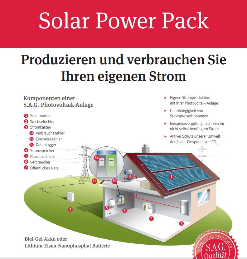 Die maximale Unabhängigkeit von ständig steigenden Strompreisen bleibt nicht länger ein Wunsch: Mit dem Solar Power Pack unseres Partners S.A.G. Solarstrom AG bietet die Schmidt Consulting & Verrieb GmbH & Co. KG (SCuV) die Antwort auf ständig steigende Strompreise. Mittels innovativer Speichertechnik lässt sich die Eigenverbrauchsquote Ihrer neu geplanten PV-Anlage erheblich steigern. Zusätzlich zum direkten Eigenverbrauch wird im Solar Power Pack ein Teil des erzeugten Solarstroms in einem Batteriespeicher gepuffert. Sie profitieren demnach auch dann von preiswertem und umweltfreundlich erzeugten Solarstrom, wenn einmal nicht die Sonne scheint !