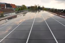 Bei diesem Projekt kamen Dünnschicht-Module zum Einsatz. Diese eignen sich am besten bei flacher Dachneigung bzw. Ost/West-Dächern da die Module besser mit diffusem Licht funktionieren.